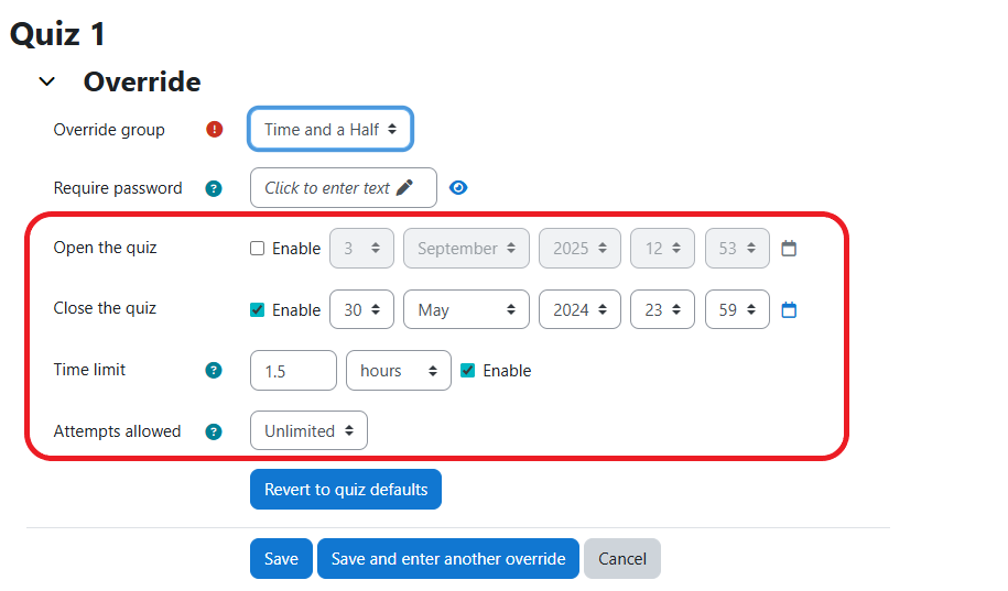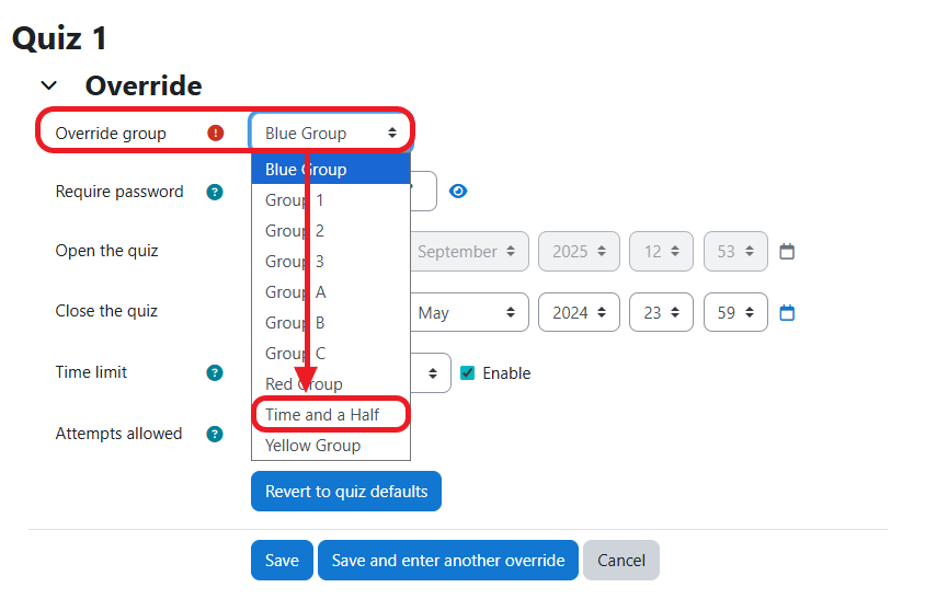 From Override group drop-down menu, select the group you want to modify quiz settings for.