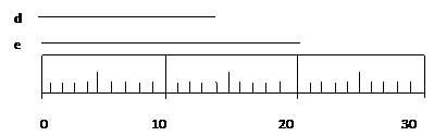 On this scale, the numbers mark 10, 20 and 30 units. Again each numbered division is divided into 10 parts, so each mark is 1 unit. Since we read between the lines, measurements should be made to 0.1 unit. Thus line d is 14.3 rather than 14 or 14.30. Occasionally in cases like this, people will forget that each mark is 1 unit instead of 0.1 unit and read the length as 10.43. Try to avoid that mistake if you can.
