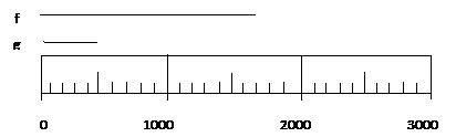Line f extends more than 7 marks (but less than 8 marks) past 1000. So its length is between 1700 and 1800. We can estimate between the marks to get 1720. Note that even though there is a zero at the end of this number it was never measured. We couldn't get that much precision from this scale. It is there to show size (1720 rather than 172) but not precision (1720 rather than 1721 or 1718). There are ways of dealing with this dilemma. Most important right now is that you recognize it as a dilemma, that properly showing the precision of a measurement is important enough that that "extra" zero is a problem.