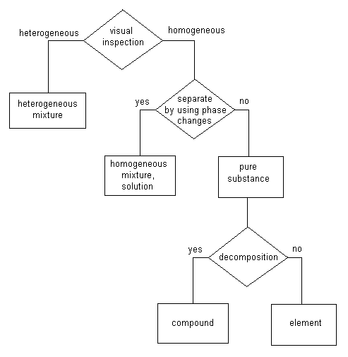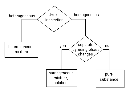 In this scheme the first test is a visual inspection. Look at the material and determine whether it is heterogeneous or homogeneous.