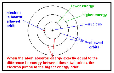 Bohr further suggested that each “allowed” orbit had a different energy – the further from the nucleus, the higher the energy. When an atom absorbed energy, an electron moved from a lower energy orbit to a higher energy orbit. Since only certain orbits were allowed, only certain amounts of energy could be absorbed – amounts corresponding to the differences in energy between the allowed orbits.
