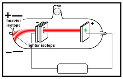 | The ability of the CRT to separate particles of different mass and charge led to the development of the mass spectrometer. When complex molecules are hit with a beam of electrons, they are broken into a variety of fragments that have different masses and charges. These can be separated in the same way that the two types of neon atoms were separated. | ![]() |