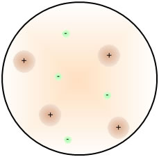 | But before the discovery of neutrons, J. J. Thomson proposed that because like charges repel and opposites attract, the atom must consist of protons and electrons distributed more or less uniformly. This is commonly referred to as the "plum pudding" model of the atom. | ![]() |