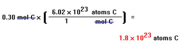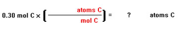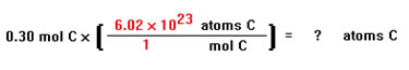 You could also use the proportionality method. Write a mathematical expression that says "0.30 moles of carbon divided by ‘x’ atoms of carbon equals 1 mole of carbon divided by 6.02x1023 atoms of carbon, then solve the equation for ‘x.’ The advantage of the conversion factor method is that you can construct a whole series of conversion factors, one after the other, to solve a multistep problem. This would be difficult with the proportionality method.