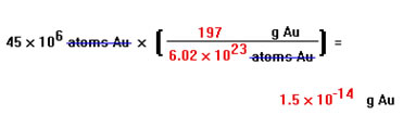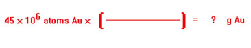 Placing units inside the conversion factor, we discover that we need a relationship between the number of gold atoms and mass. |