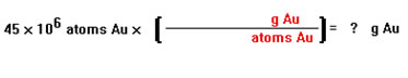 Here’s a slightly different problem. This one involves a relationship between the number of atoms and their mass. To solve it, we will use the fact that we know both the mass of a mole and the number of atoms in a mole. Though it’s not standard notation, we’ll write 45 million like this: 45x106 atoms Au. We could also convert this number to proper scientific notation: 4.5x107 atoms Au, as we did in the workbook.