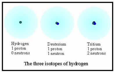 Of the three isotopes shown, the first accounts for 99.985% of hydrogen atoms. Deuterium accounts for 0.015%, virtually all the rest. Fewer than one atom in 100,000 is tritium, the radioactive form of hydrogen. |
