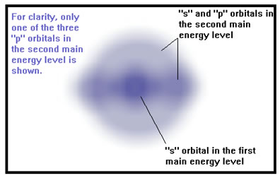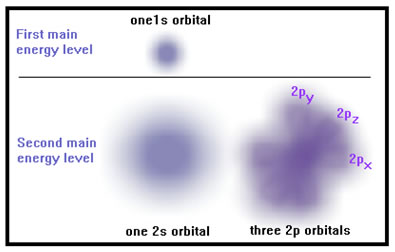 Also, the higher the main energy level, the more orbitals it contains. The first main energy level has only one orbital, called and "s" orbital. The second main energy level also has an "s" orbital and three "p" orbitals as well. |