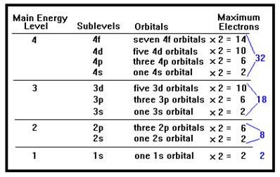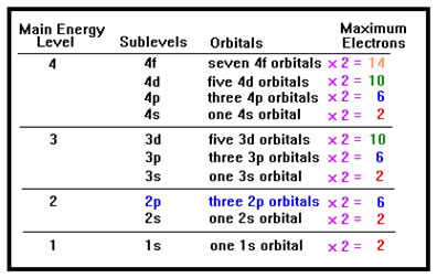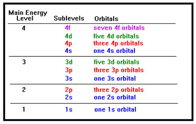 Since p orbitals always occur in groups of three, a p sublevel can always hold up to six electrons, no matter what main energy level it's in. Since d orbitals always occur in groups of five, a d sublevel can always hold up to ten electrons, two per d orbital in the sublevel. The distinction between main energy levels, sublevels, and orbitals is frequently confusing to students. The fact that the sublevels and the orbitals have the same names does not help. A 2p sublevel contains three 2p orbitals. A 3d sublevel contains five 3d orbitals. If you learn to look for the word "orbital" and "sublevel" after the designation, the patterns won't be so confusing – p sublevels can always hold 6 electrons because they always have three p orbitals. The d sublevels all have five d orbitals and can hold 10 electrons. The s sublevels always have a single s orbital and can hold only two electrons. |