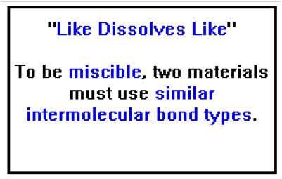 Intermolecular bond types also determine whether two chemicals are miscible, that is, whether they can be mixed together to form a homogeneous solution. But here, the key is whether the two materials use similar intermolecular bond types.