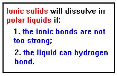 When an ionic compound dissolves in a very polar liquid like water, the ionic bonds are broken and the ions separate. Some of the hydrogen bonds between water molecules also break and the water molecules separate to make room for the dissolving ions. Finally a new type of bond we have not seen before forms. This bond is called an ion-dipole bond.