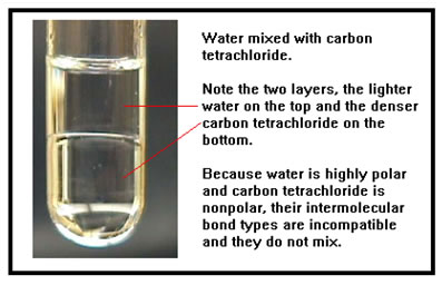 Here is a photo of ethanol, CH3CH2OH, in both water and carbon tetrachloride. Ethanol contains both a nonpolar group, the CH3CH2 or hydrocarbon end, and a polar group, the OH end. Ethanol, also called ethyl alcohol, is the alcohol in alcoholic beverages. It’s dual nature – the molecule has both polar and nonpolar regions, means it dissolves in both the blood and in the body’s fatty tissue, which is one reason it is able to reach the brain. The other reason is its small size. |