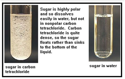 In these photos, sugar is mixed with water and with carbon tetrachloride. Sugar contains many hydrogen atoms bonded to oxygen atoms and therefore is very polar. Sugar is just as soluble in water as iodine is in carbon tetrachloride. Common table sugar consists of two rings of carbon atoms. On each carbon atom except one there is an oxygen which is bonded, in turn, to a hydrogen. Each sugar molecule contains eight O-H bonds. No wonder it is so soluble in water. |