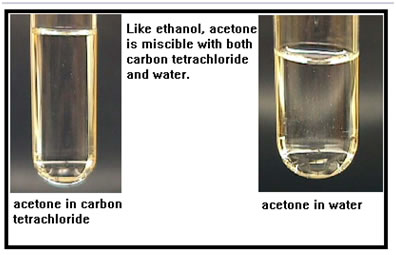 Acetone is similar to ethanol, it has both a polar and a nonpolar section. This is acetone mixed with water and with carbon tetrachloride. Ethanol is mildly toxic. Acetone is much more so. Acetone is sometimes produced in the body when the diet is heavy in protein and low in carbohydrates. When this happens, the body goes into a condition known as ketosis and the telltale odor of acetone can be detected on the breath. Ketosis, if it is not treated, can lead to death. |