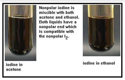 What would you predict will be the result of mixing iodine, a nonpolar molecule, first with acetone, and then with ethanol? You can see the result of mixing these two combinations in the photo. Describe what you see in part c. of Exercise 13. You should have predicted that iodine would be miscible with both ethanol and acetone. Both of these chemicals have a nonpolar portion of their molecule that is sufficient to allow them to mix with carbon tetrachloride, therefore one would expect that they would be miscible with other nonpolar molecules, such as iodine. |