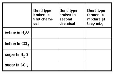 Summarize what happens when iodine and sugar are mixed with water and carbon tetrachloride by completing the table in part d of Exercise 13. If you do this correctly, you will see that when two chemicals do mix, the bond types that form are the same as the bond types that are broken.