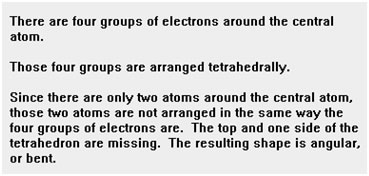 And when there are four groups of electrons around the central atom, but only two atoms, the molecule is said to have an angular or bent shape. This shape is similar to the angular shape of a molecule with three groups of electrons and two lone pairs. The major difference is that in this case the angle between the two bonds is smaller (about 109.5o) than it was with three groups of electrons and one lone pairs (about 120o). Two lone pairs of electrons push the bonds farther down than one lone pair does. |