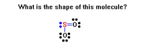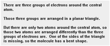 When there are three groups of electrons around the central atom, but only two atoms, these atoms are said to be in an angular or bent arrangement. Notice that the lone pair of electrons is pushing the two bonds down, causing them to be closer together than if there were no lone pairs. This angular – or bent – arrangement of the bonds gives the molecule its shape. The angle between the bonds is approximately 120o. The second figure shows what the molecule looks like the when the “invisible” lone pair is not shown.