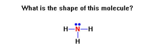 When there are four groups of electrons around the central atom, but only three atoms, the molecule is said to have a trigonal pyramid or triangular pyramid shape. Again, the lone pair is pushing the bonds down. The shape of the molecule is the bottom half of the tetrahedron, called a trigonal pyramid (or triangular pyramid). The difference between this shape and a tetrahedral shape (both of which can be imagined inside a pyramid with a triangle for a base) is that in a tetrahedral shape the central atom is in the middle of the pyramid, while in a trigonal pyramidal shape, the central atom is at the top of the pyramid. |