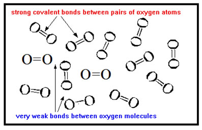 Compare the bonding of a dozen iron atoms to the bonding of a dozen oxygen atoms. The strong metallic bonds that hold iron atoms together hold all twelve atoms together. The strong covalent bonds that hold oxygen atoms together bond pairs of atoms into six separate molecules. Each oxygen atom is strongly bonding to only one other oxygen atom. Each molecule is essentially unattached to any other molecule, which is why oxygen is a gas. |