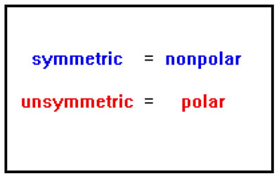 The general principle is that if a molecule is symmetric, its electrons will be uniformly distributed and it will be nonpolar. It’s the same idea you used to determine whether a bond was polar. If the two atoms were the same, the bond was symmetric and therefore nonpolar. |