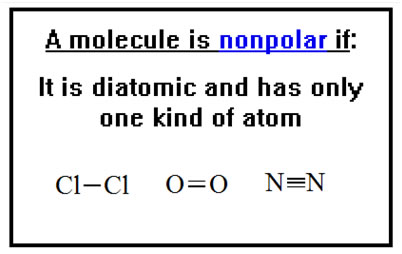 In the last module we used diatomic molecules as examples, where it was easy to see whether the molecule was polar or nonpolar. If the two atoms were the same, the molecule had to be nonpolar, and if they were different, the molecule was polar.