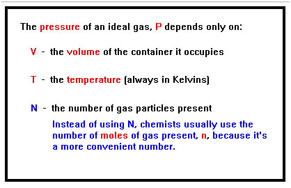 It is possible to calculate the pressure exerted by an ideal gas using the laws of physics. Such calculations predict that the pressure will depend on only three things: the volume of the container the gas occupies, the number of gas particles that are present, and the temperature. Instead of using N, the actual number of gas particles, we customarily use n, the number of moles of gas particles, to make the numbers more manageable. This also simplifies the task, should we need to do it, of computing how many gas particles are in a given mass of gas. Recall that a mole is just a convenient number (6.02 x 1023) of atoms or molecules. It is convenient because it is the number of particles that are found in the atomic (or molecular) weight of a substance in grams. |