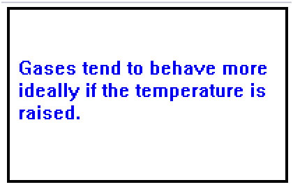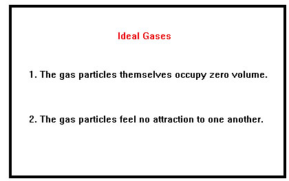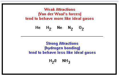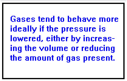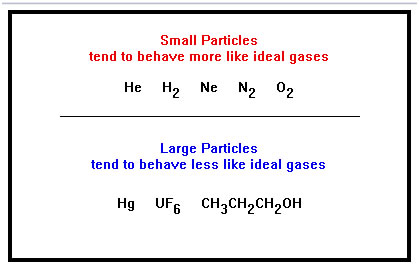 Gases whose particles are small will also behave more like ideal gases than gases consisting of large molecules. In an ideal gas, the molecules themselves are assumed to occupy no volume at all. But when we speak of the volume occupied by a gas, V, we are talking about the volume of the container. |