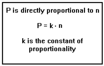 The fact that P and n are directly proportional means not just that when n increases so does P, it means that when n is doubled, so is P; when n is tripled, so is P; when n is cut by one fourth, so is P. In general, when n increases or decreases, the ratio of the new to the old values of n will be the same as the ratio of the new to the old values of P. The value of the constant k determines how large P is compared to n, but no matter what value k has, large or small, the correspondence between the ratio of the change in n and the ratio of the change in P will exist.