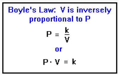 For an ideal gas, the pressure is inversely proportional to the volume of the container. Mathematically, we can express this by saying that the pressure is equal to a constant times one over the volume or that the pressure times the volume equals a constant. This time, the value of the constant depends on the temperature and the number of moles. This relationship is known as Boyle’s Law. |