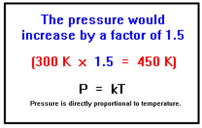 Here, the collisions would become more violent and they would also become more frequent, in both cases because the gas particles would be moving more rapidly. It turns out that, as long as the temperature is expressed in Kelvins, the pressure is proportional to the temperature and since the temperature increased by a factor of 1.5, so would the pressure. It is not obvious why, if both the force of the collisions and their frequency increase, the increase in pressure would be proportional to the temperature.