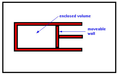 This drawing shows a constant pressure container. The wall on the right is moveable – like a piston. It will stay put as long as the pressures inside and outside the container are the same. If the pressure inside increases, the wall will begin to move out and the resulting increase in volume will lower the pressure inside the container. This will continue until the pressures inside and outside are once more equal. |