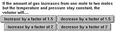 Increasing the number of moles of gas would cause the pressure inside the container to increase. This would, in turn, move the piston out. To compensate for doubling the number of moles of gas, the container’s volume will have to increase by a factor of two. (In fact, the pressure will increase only enough to overcome the friction between the moveable wall and the interior walls of the container. Still, we can predict the final state of affairs by imagining that first the pressure increases to its maximum, then the container expands to return the pressure to its original value. Since we double the number of moles of gas, the pressure would double. Then, to put the pressure back in half, the volume would have to double.)