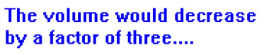 Again, because the temperature has not changed, the collisions will be no more or less violent, but the number of collisions will change. In one third the volume, each gas particle has, on the average, one third the distance to go before hitting the wall of the container, and will therefore do so three times as often, increasing the pressure by a factor of three.