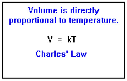 The volume of an ideal gas is proportional to it temperature. Mathematically, V=kT. This is known as Charles’ Law. |