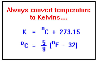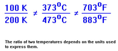 Now let’s try temperature. Doubling 100K gives us 200K. But in degrees Celsius, the temperature went from 373 to 473, and the ratio is only 1:1.27 not double. In degrees Fahrenheit, the temperature changed from 703 to 883, a ratio of 1:1.26. So, unlike converting volumes or pressures, to convert from one temperature to another, you may or may not have to multiply, but you always have to add a constant: K = oC + 273.15 Doubling the temperature in oC does not double the temperature in oF or K. |