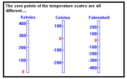 But 0 oC is arbitrarily defined as the freezing point of water, which is 32 oF and also corresponds to 273.15 K, so the zero points of the temperature scales are not all the same. The reason that the Celsius scale was based on the freezing and boiling points of pure water (0 oC and 100 oC, respectively) was that these were easy to reproduce in any laboratory. That meant that temperatures measured in one laboratory could be accurately compared with temperatures measured in any other. |