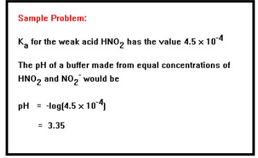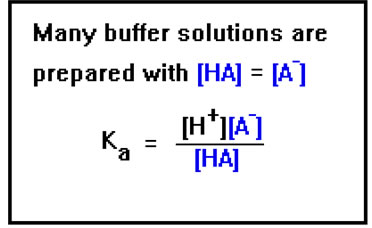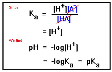 But if the concentrations of A- and HA are equal, they cancel from the equation, and the H+ concentration will therefore be the same as Ka, the acid dissociation constant. If [A-] and [HA] are not the same, it is a simple matter to solve the equation for [H+] and plug in the values of Ka, [A-], and [HA]. The pH is then just the negative logarithm of this value. |