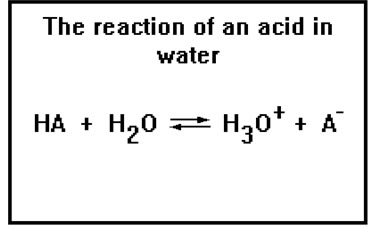This reaction describes an acid donating its proton to water. The strength of the acid can be measured by measuring the concentration of the hydronium ions present at equilibrium.