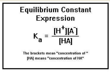For any given acid, the product of the hydronium ion concentration times the A- ion concentration divided by the concentration of HA is a constant, called the equilibrium constant and is given the symbol Ka.