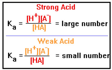 If HA is a strong acid, [H+] and [A-] will be high, while [HA] will be low, and so Ka will be a large number. If HA is a weak acid, the opposite will be true and Ka will be a small number.