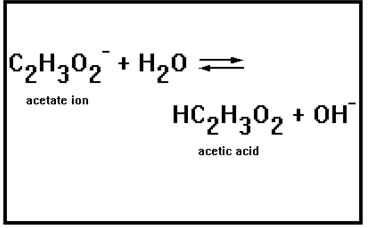 The acetate ion is the conjugate base of acetic acid, a weak acid, thus the acetate ion is a weak base. The reaction is shown with arrows going in both directions. |
