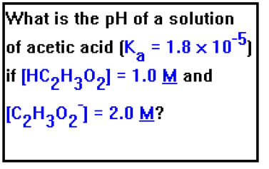 First we solve the equilibrium constant expression for [H+]. Then we substitute the values for the known concentrations and the Ka. Finally, we take the negative log of the result. In a logarithm, the significant digits are those that follow the decimal point. Since 1.8 x 10-5 has two significant digits, we keep two digits after the decimal point in the pH. |