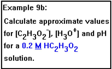 Example 9b asks for the acetate and hydronium ion concentrations and the pH of a 0.2 M solution of acetic acid. The pH can be calculated once we know the value of [H3O+], since pH is just the negative log of the hydronium ion concentration. To determine the concentration of the acetate ion we will make use of the fact that when the acid dissociates, it releases one acetate ion for each hydronium ion, thus the concentration of these two ions must be the same. We know the value of the Ka from the previous example. |
