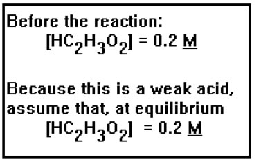 The concentration of acetic acid given, 0.2 M, refers to the concentration of the acid before it dissociates. Since this is a weak acid, we will start by assuming that only a very small fraction of the acid molecules dissociate so that, at equilibrium, the concentration of the acid is still very nearly 0.2 M. Acid concentrations are commonly given as the number of moles of acid in solution before any protons have been donated. Once the reaction has reached equilibrium, the amount of undissociated acid will depend on how strong the acid is. For a strong acid, this will be essentially zero. However, for weak acids, only a tiny fraction of the acid dissociates, so that the concentration of undissociated acid at equilibrium will be very nearly equal to its original value. |