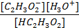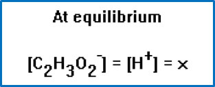 Since, when the acid dissociates, one acetate ion will be left behind each time one proton is donated, the concentration of acetate ions and the concentration of H3O+ ions will be equal. We’ll call the concentration x. In water there is a very small number of H3O+ ions present from the water itself. This is too small to matter unless the acid is very weak, that is, its Ka is less than about 10-14. Since the Ka for acetic acid is 1.8 x 10-5, we can ignore the small concentration of H+ ions from the water and our assumption that the number of hydronium ions is the same as the number of acetate ions is valid. |