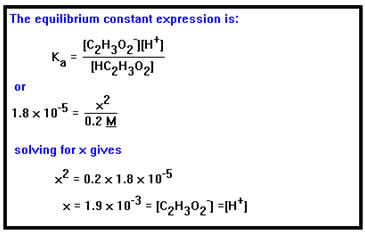 From the previous example, we know that Ka = 1.8 x 10-5. We can now substitute these values into the equilibrium constant expression and solve for x. This tells us both the acetate and hydronium ion concentrations. Since 0.0019 mol/liter of H+ ions are present, this same amount of acid must have dissociated, so that the actual concentration of acid is just 0.2- 0.0019, or 0.1981 M, not 0.2 M. This represents an error of less than 1%. Since we have the concentration to only one significant digit (0.2 M), an uncertainty of about 10%, our assumption is justified. |