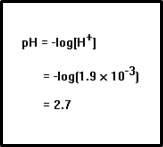 To calculate the pH, we simply take the negative log of the [H+]. The pH of this solution is 2.7. |