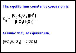 To calculate the value of the Ka, we will need the values of the concentration of lactic acid, lactate ion, and H+ at equilibrium. We will essentially work the previous problem in reverse, in the process making the same set of assumptions. |