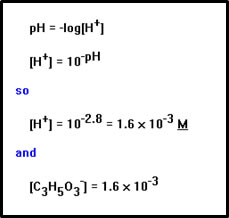 We begin by assuming, as we did in the previous example, that the concentration of lactic acid is the same before and after equilibrium is established, 0.02 M. If all the lactic acid dissociated, the [H+] would be 0.02 M. The negative log of this number is 1.7. Since the pH of this solution is 2.8, we can assume we are dealing with a weak acid and that our assumption is reasonable. |